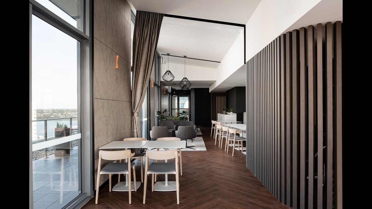 Sophisticated foyerRooftop barNetworking areasFloor-to-ceiling windowsPolished neutral finishesLayered ambient lighting